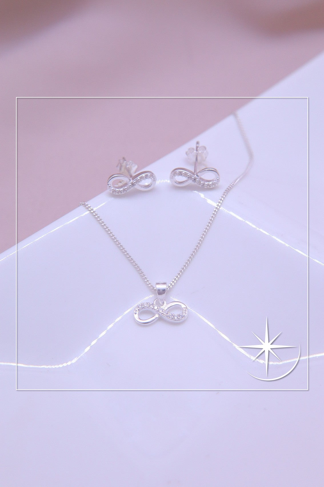 Cadena y topos en forma de infinito en plata que simboliza amor eterno y conexión sin fin, cada pieza está adornada con delicadas circonias brillantes que capturan la luz para un toque de sofisticación y estilo