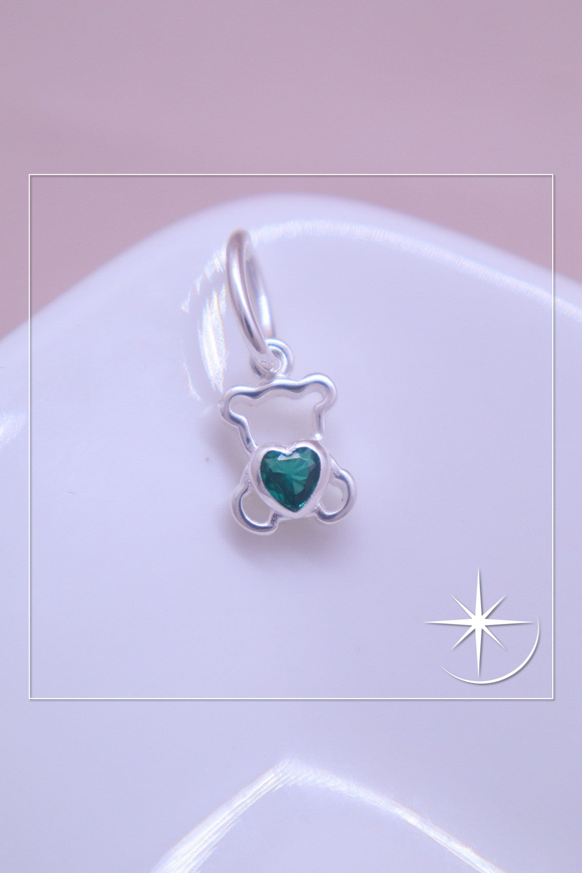 Tierno y delicado dije en forma de osito con un diseño abierto que resalta su forma adorable. En el centro, luce un brillante cristal en forma de corazón color esmeralda, símbolo de amor y ternura.