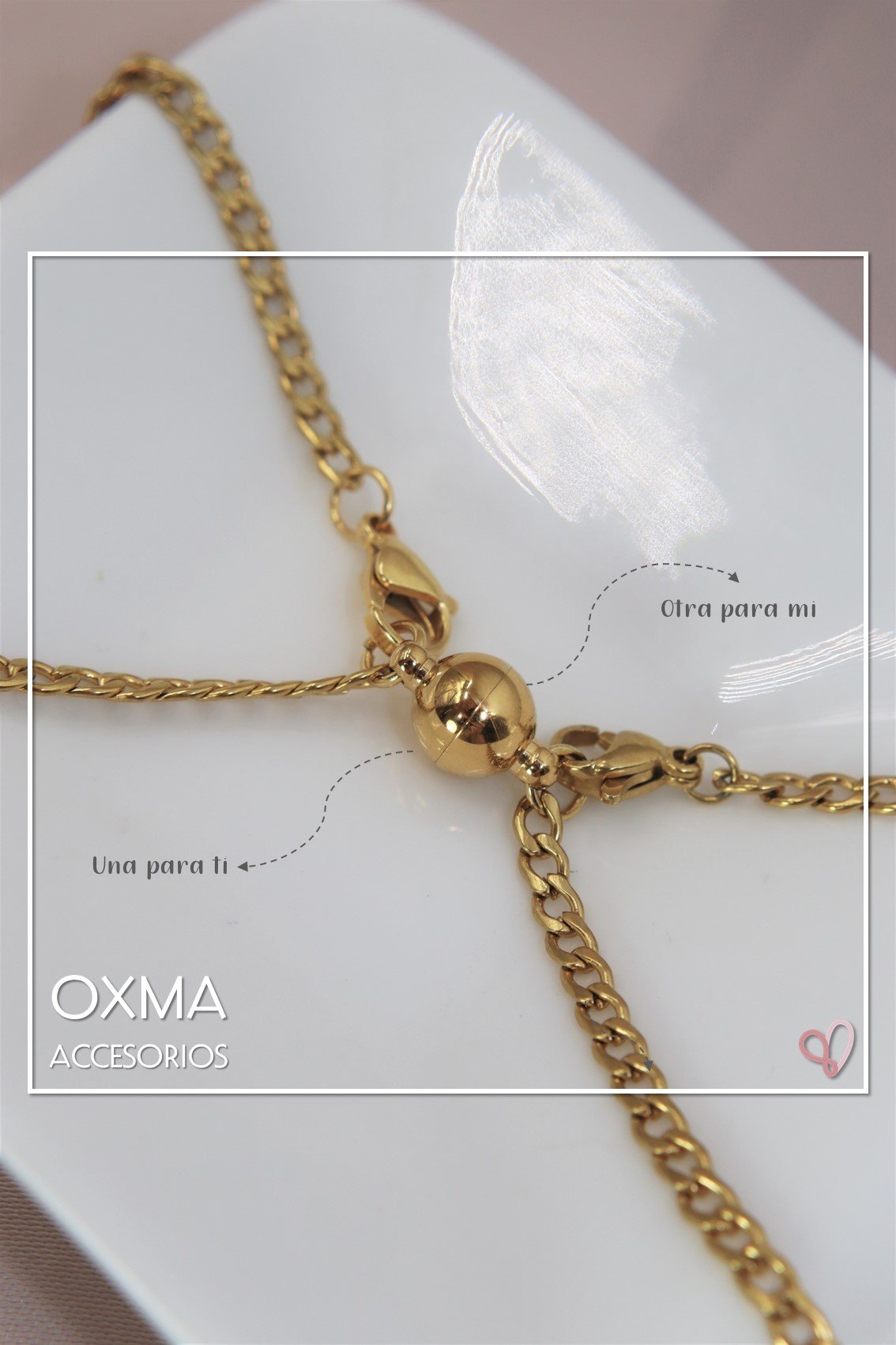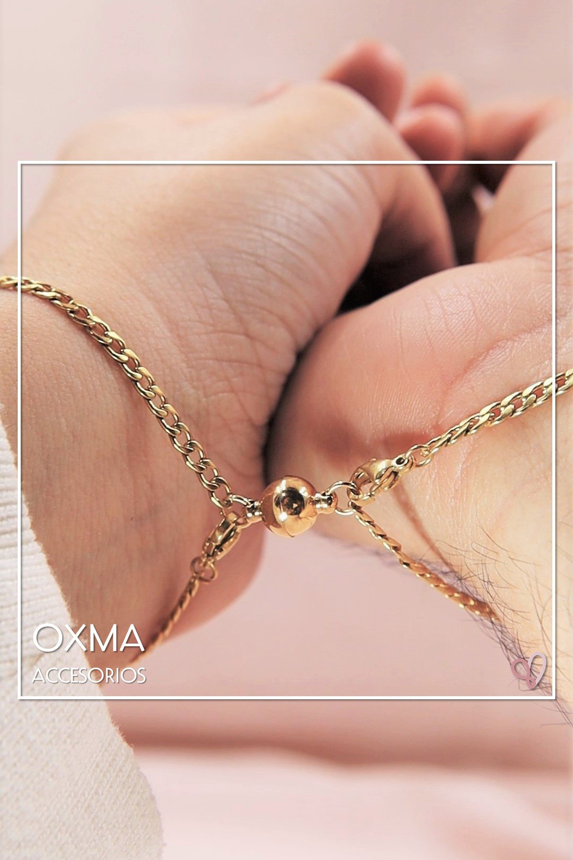 Pareja de pulseras en acero inoxidable, con baño de oro 24k, con dije imantado. Recuerda elegir la medida de tu pulsera con base a la medida de tu muñeca + 1 cm para que no te quede muy apretada. Si no conoces la medida recomendamos 17cm para mujer y 19 cm para hombre.